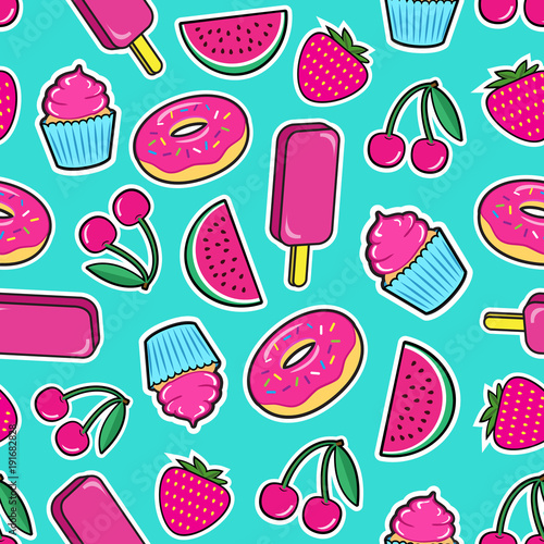 Cute Seamless Pattern With Colorful Patches Stickers Of Ice Cream